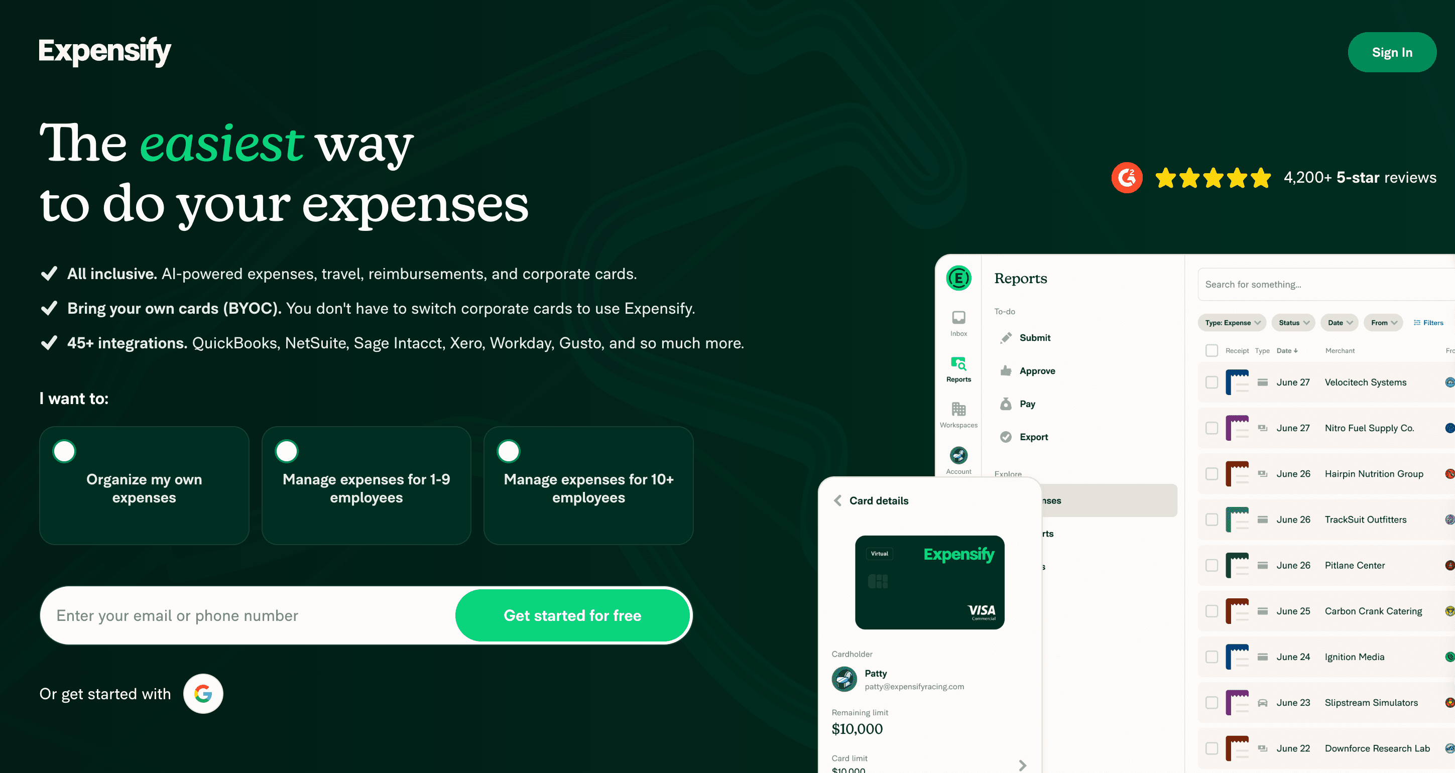 Expensify is one of the most widely recognized AI expense trackers on the market, built primarily to streamline employee reimbursements and corporate card management. Its core strength lies in its SmartScan technology, which relies on OCR and machine learning to read receipts on the fly. It is highly suited for companies with traveling employees and sales teams who need a "scan-and-forget" solution that automatically routes expenses for manager approval.