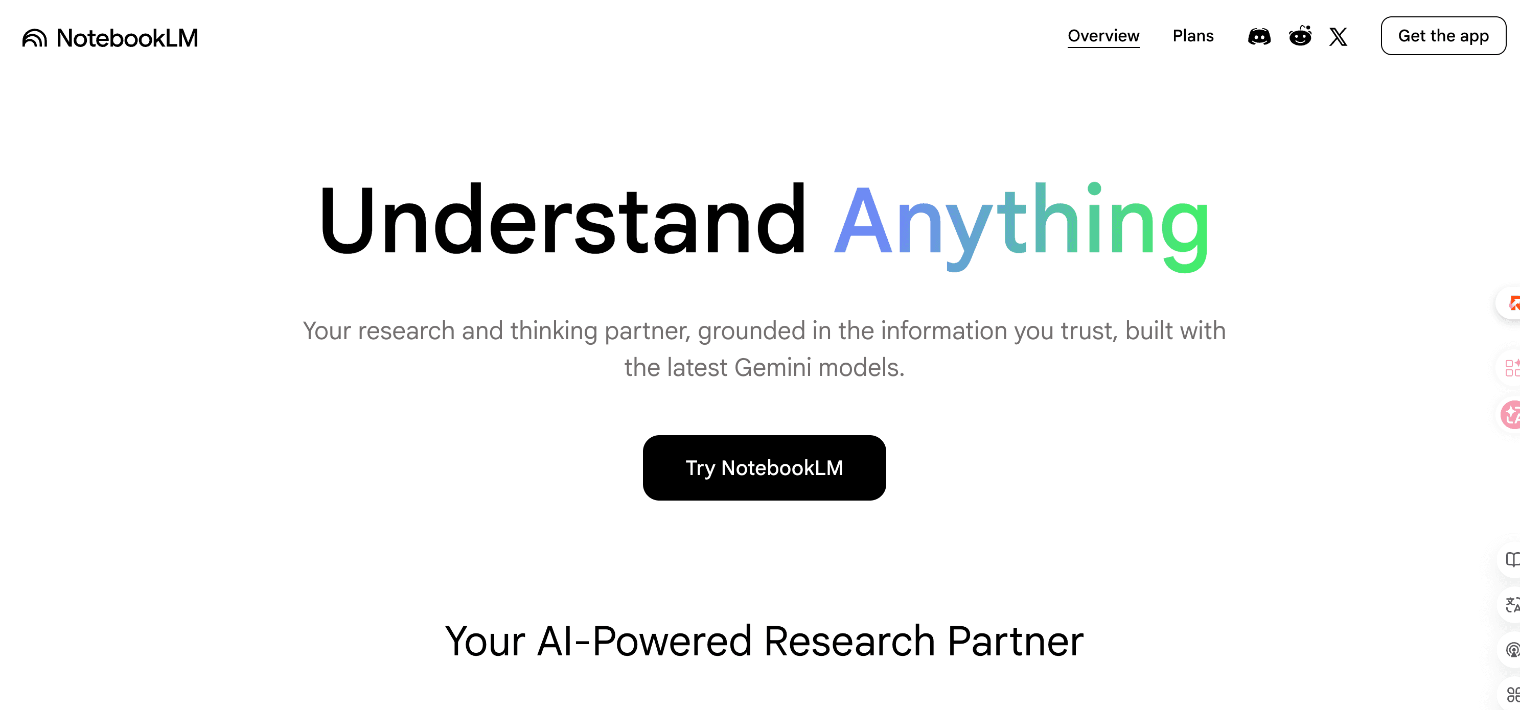 Google NotebookLM is a specialized, experimental AI workspace built purely around document understanding. Backed by the Gemini Pro 1.5 model, it acts as a virtual research assistant that only grounds its answers in the specific documents (PDFs, Google Docs, URLs) you upload to a specific "notebook."