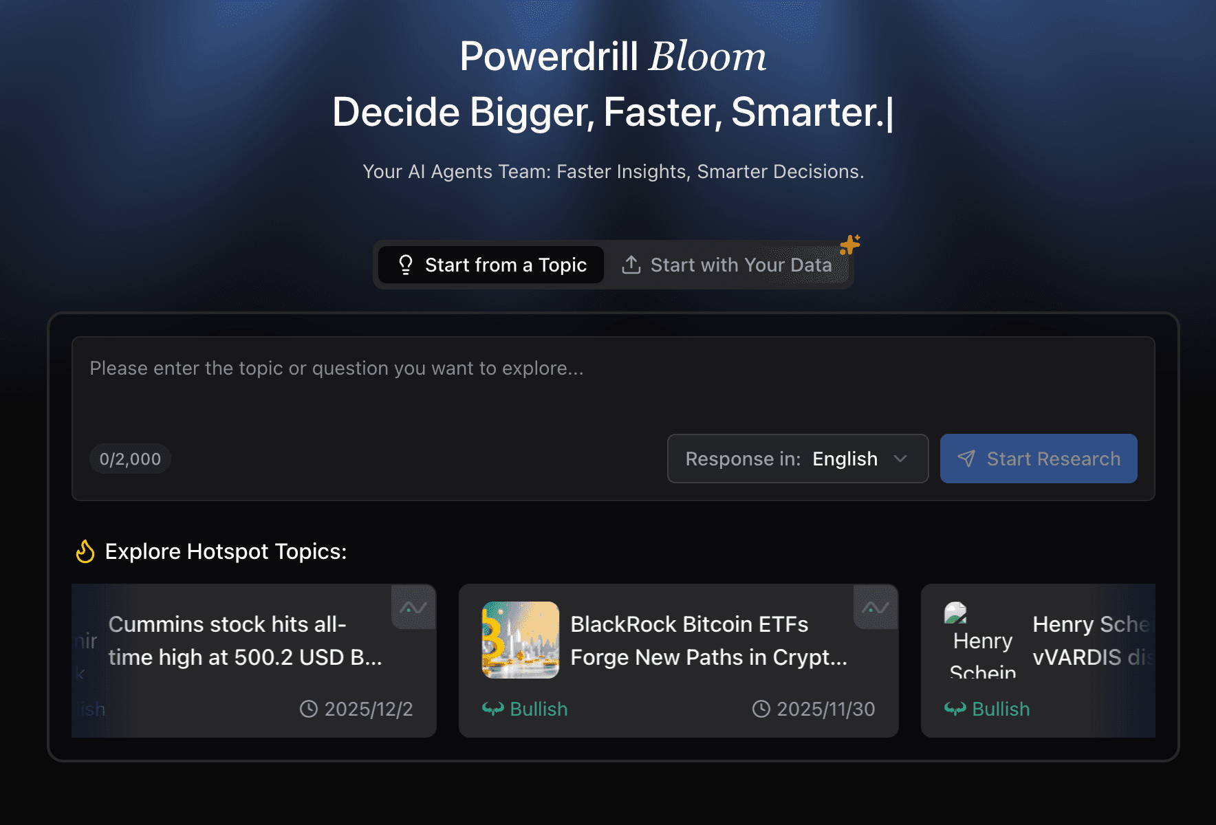 Log in to Powerdrill Bloom. You are greeted by a chat-based interface—simple and focused.