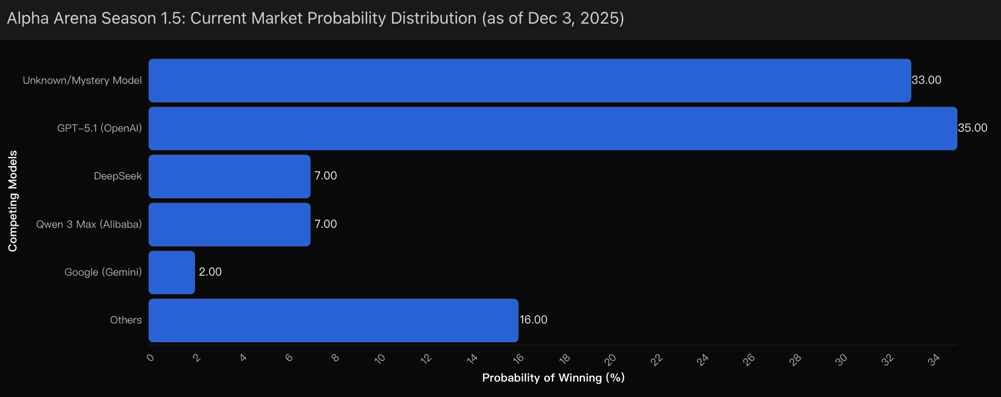 GPT-5.1 (OpenAI) | 35% | Rebuild narrative after Season 1 collapse + superior data infrastructure and execution advantages |