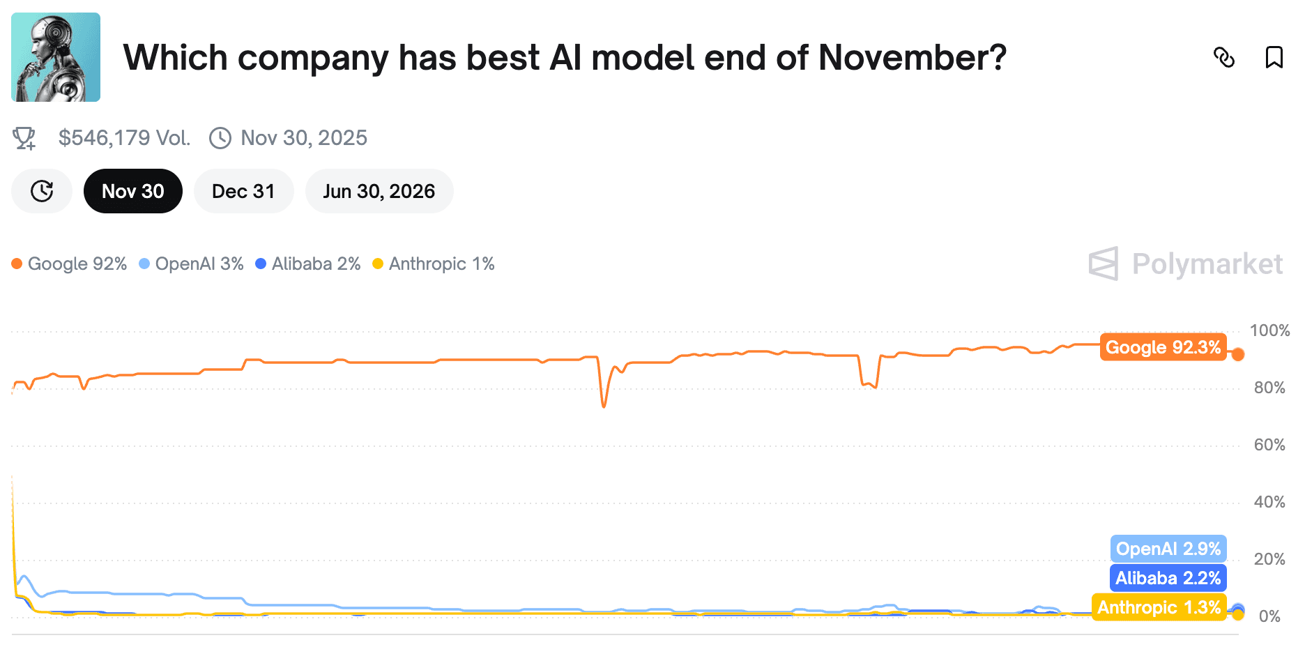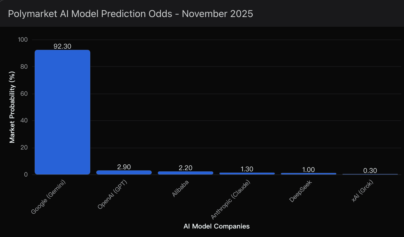 Prediction markets, in their chaotic efficiency, have a way of cutting through hype. On Polymarket, traders currently price Google’s odds of leading AI rankings at 92.3% — a staggering vote of confidence.