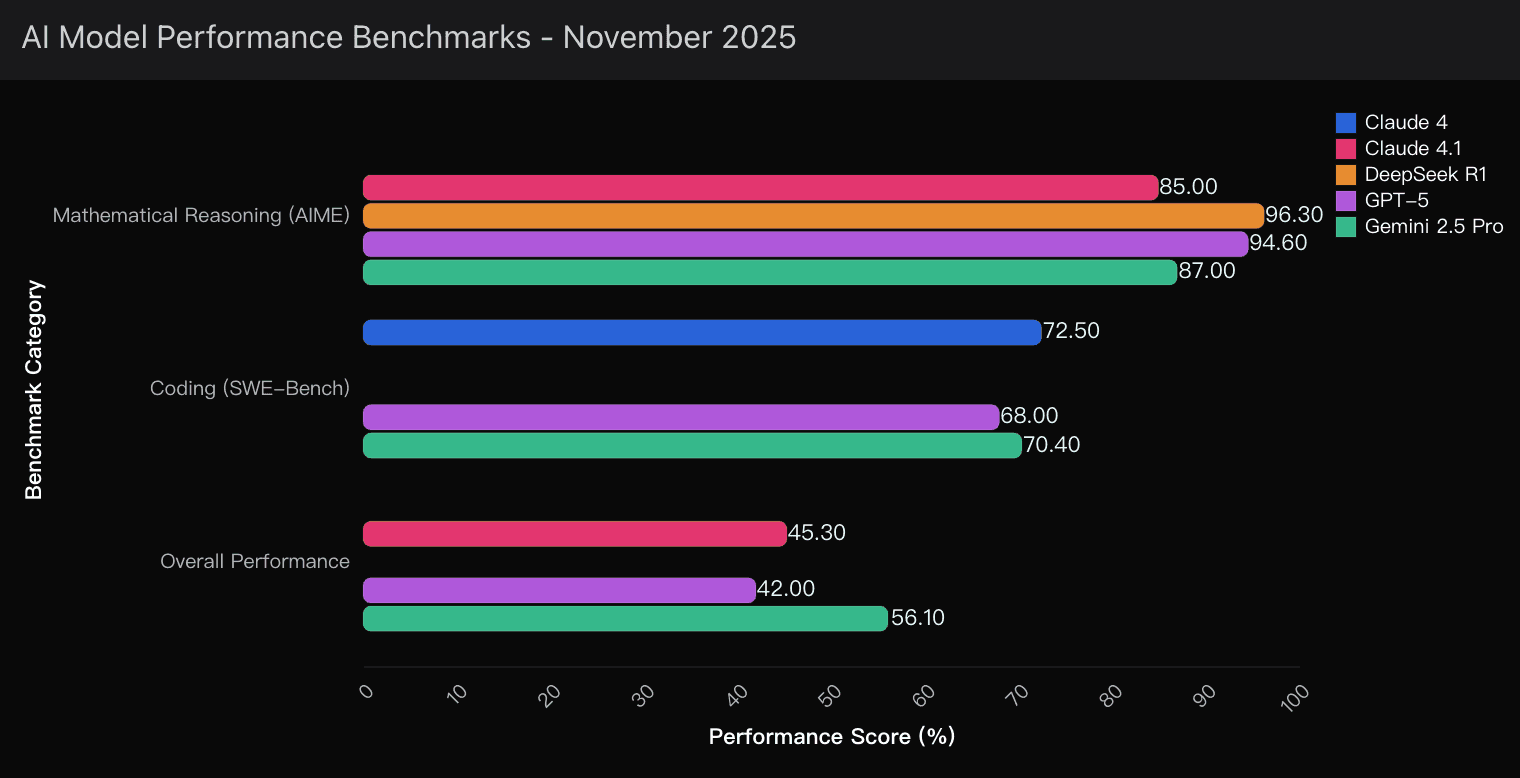 Claude 4 dominates the SWE-Bench with 72.5% coding accuracy.