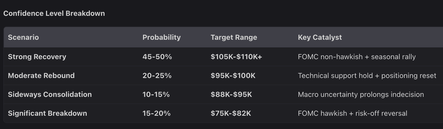 Bear tail (30–35%): Fed hawkishness or a macro shock pushes price to test $80K–$82K; deeper extremes possible with cascading liquidity events.