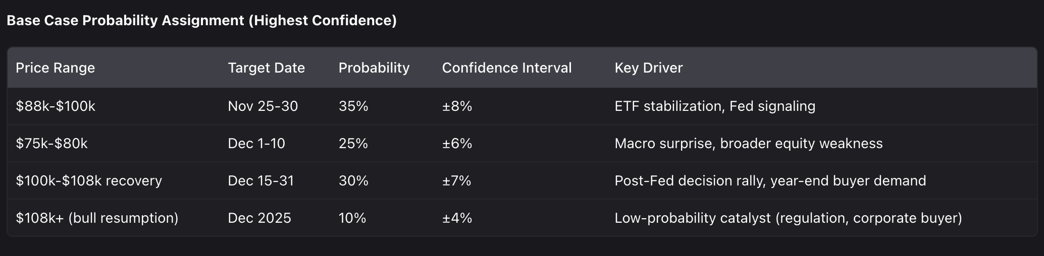 My base case anticipates the Fed holds in December but signals easing for early 2026. Once clarity emerges, risk assets historically rally 8–15% within four weeks — and Bitcoin rarely lags that pattern.