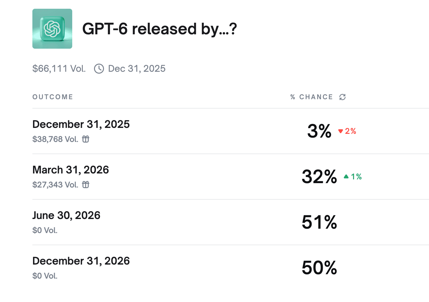 December 31, 2026 | 40% | A fallback scenario — plausible if deep technical challenges emerge or if OpenAI bundles GPT-6 with its next-gen infrastructure showcase. |