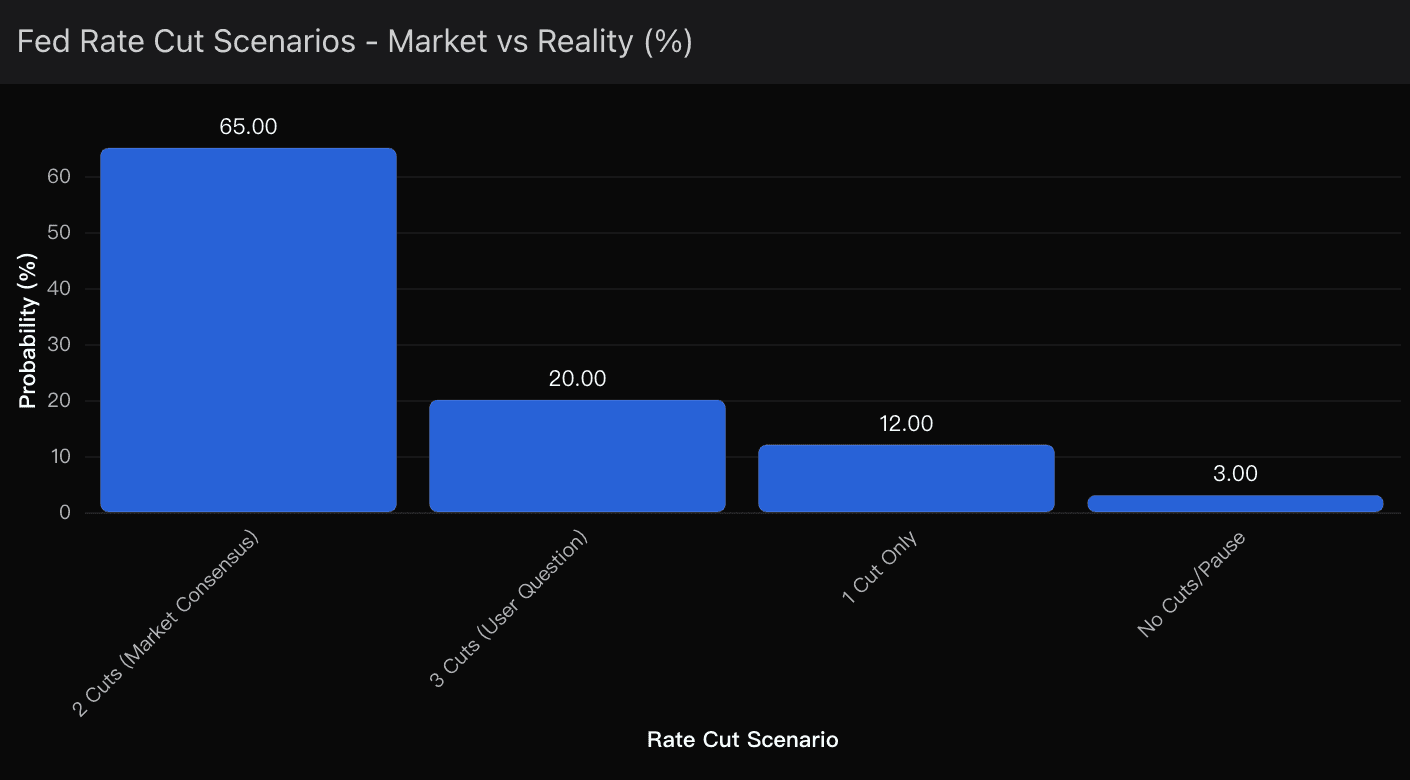 3 Cuts (Dovish Scenario) | 20% | Inflation cools sharply, job market softens faster than expected |