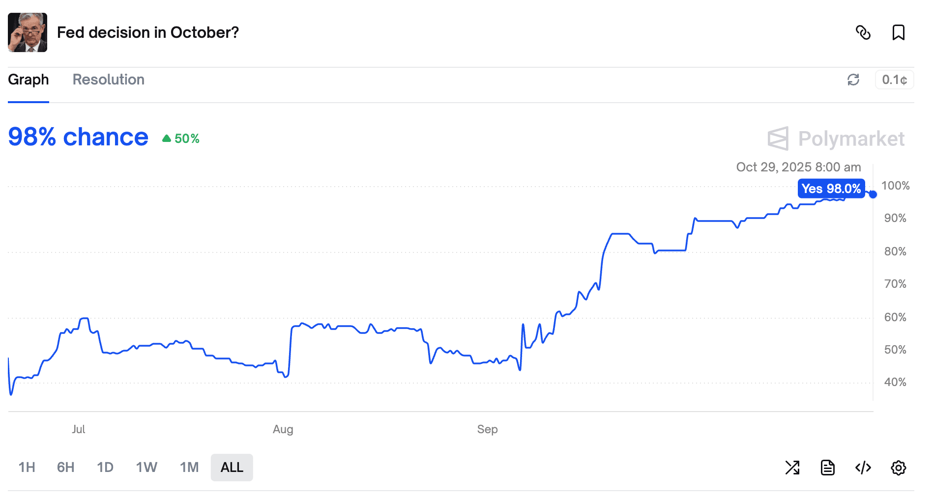 Let’s start with where the data stands. Polymarket bettors had it almost perfect — a 98% probability of the October 25bp cut, which materialized as expected. But for December, the optimism is already fading: futures now imply just 84% odds of another cut, down from 90%+ weeks ago.