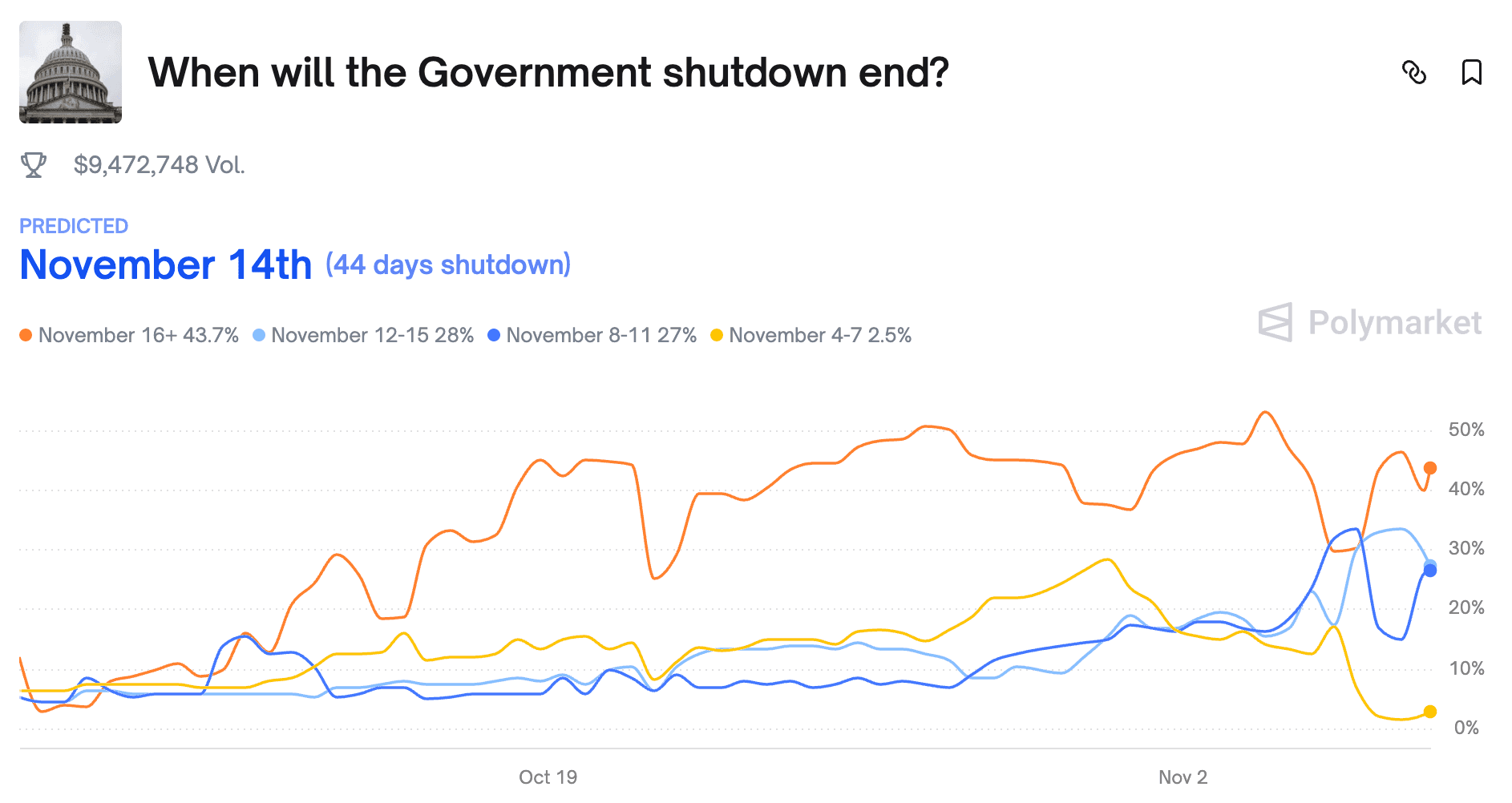 On Polymarket, traders currently assign a 46% probability that the federal shutdown extends beyond November 16th. My read diverges from the market consensus: the very intensity of aviation disruption is accelerating the countdown to resolution.