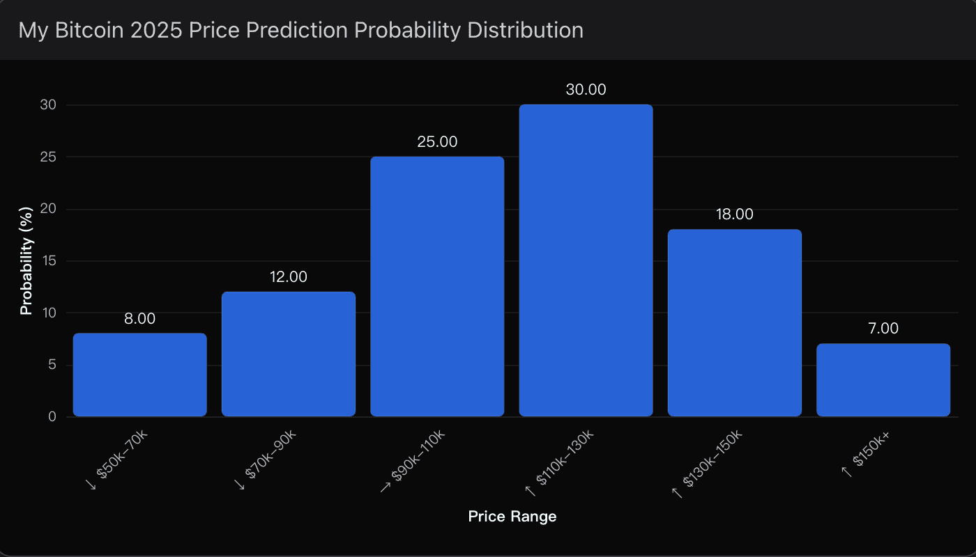 My base case prediction is that BTC trades within the $110K–$130K range during the second half of 2025, with a 30% probability concentration in that zone.