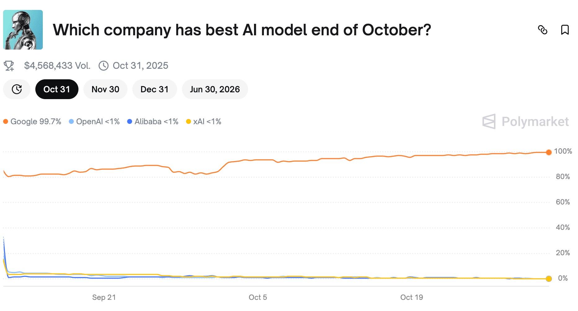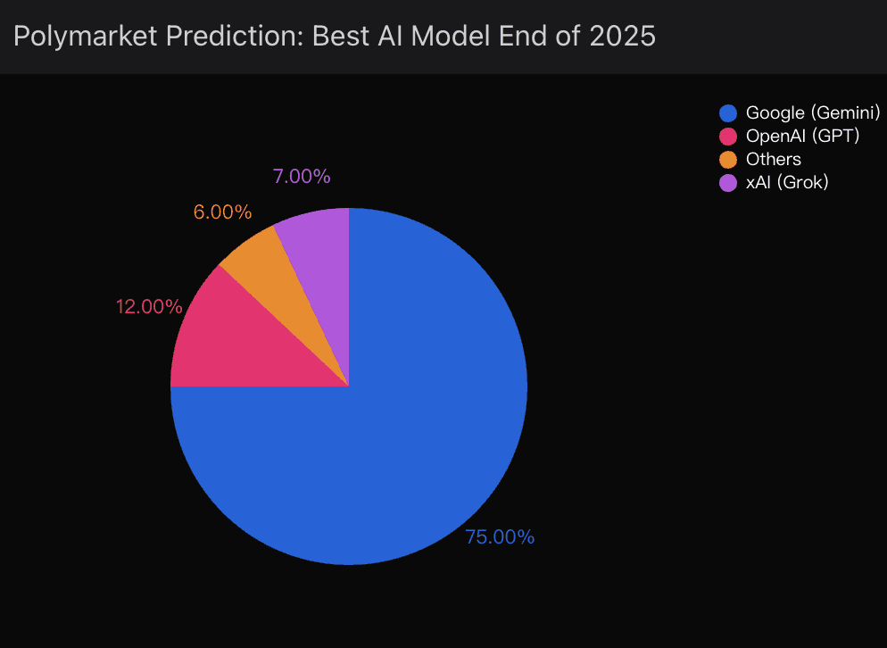 Polymarket’s live odds still show Google leading with 75% probability for “Best AI model by year-end.”