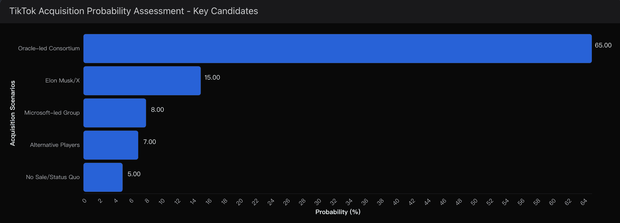 Trump has publicly expressed “comfort” with Elon Musk acquiring TikTok. While this currently sits at a 15% probability, Musk’s unpredictability and Trump’s loyalty patterns make this a tail risk worth watching. If Musk formalizes a bid backed by foreign capital, it could shift political momentum almost overnight.