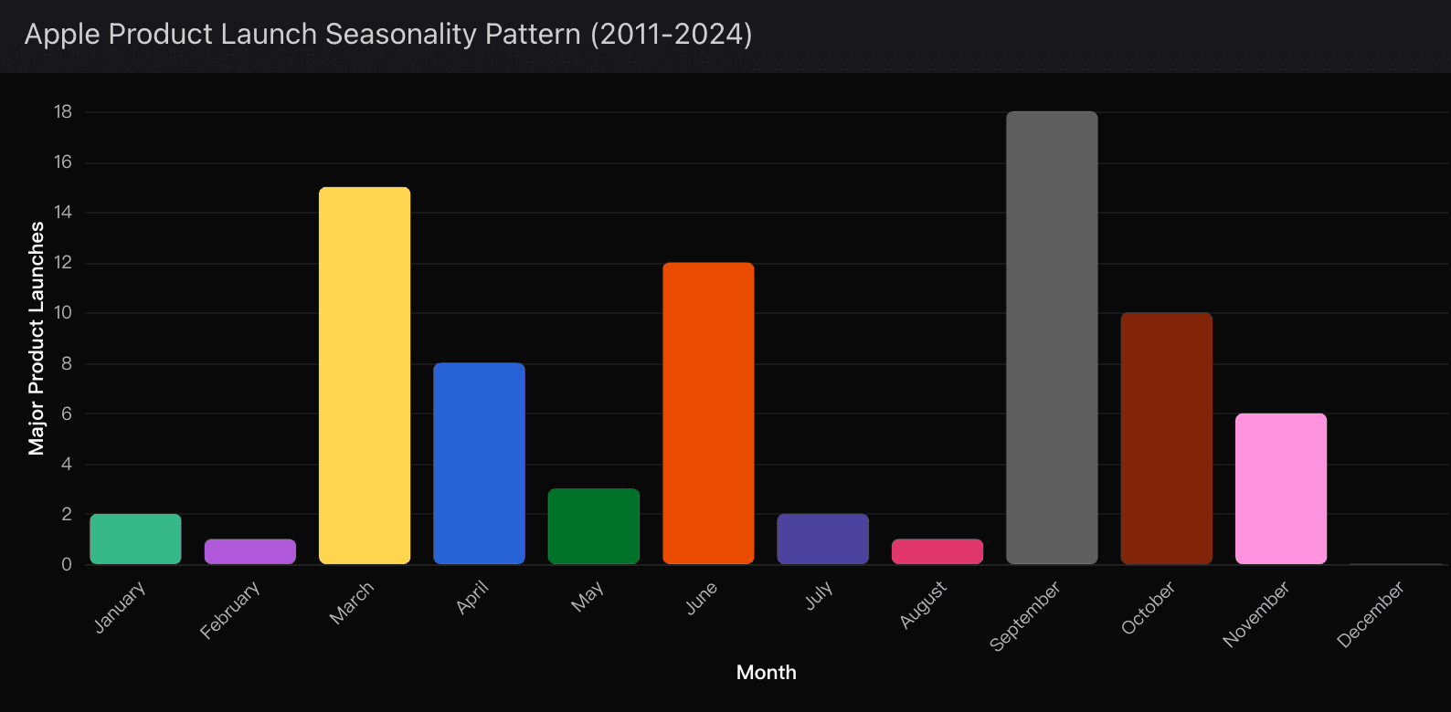 Powerdrill Bloom ’s event-timing model scores December as a 0.03 launch probability month for Apple — the lowest across their entire product calendar.
