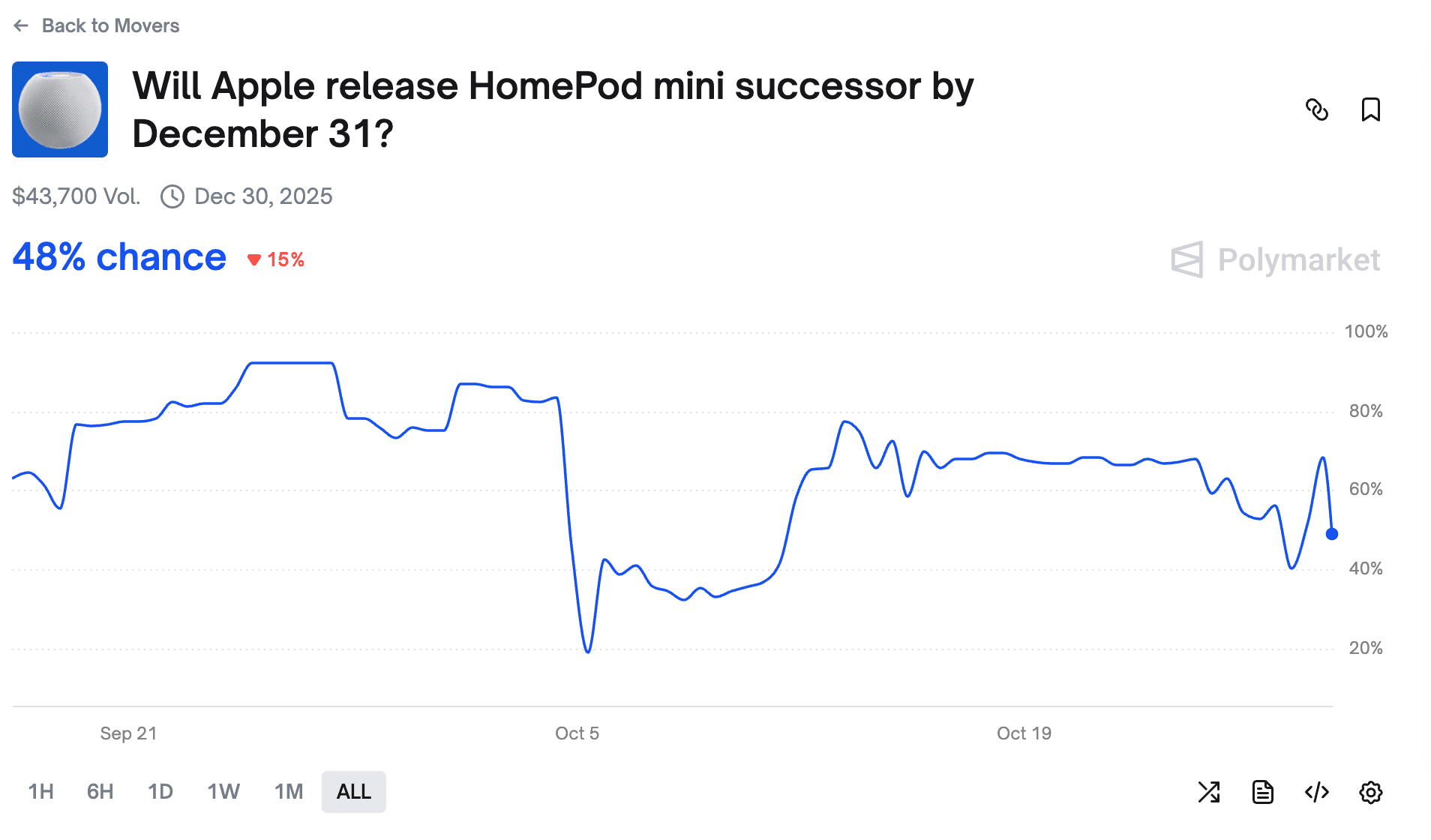 Every so often, prediction markets light up around Apple — the most predictable company in the world. And yet, each time, people bet on the improbable. I also saw that there is a discussion on polymarket about the topic "Will Apple release HomePod mini successor by December 31?"