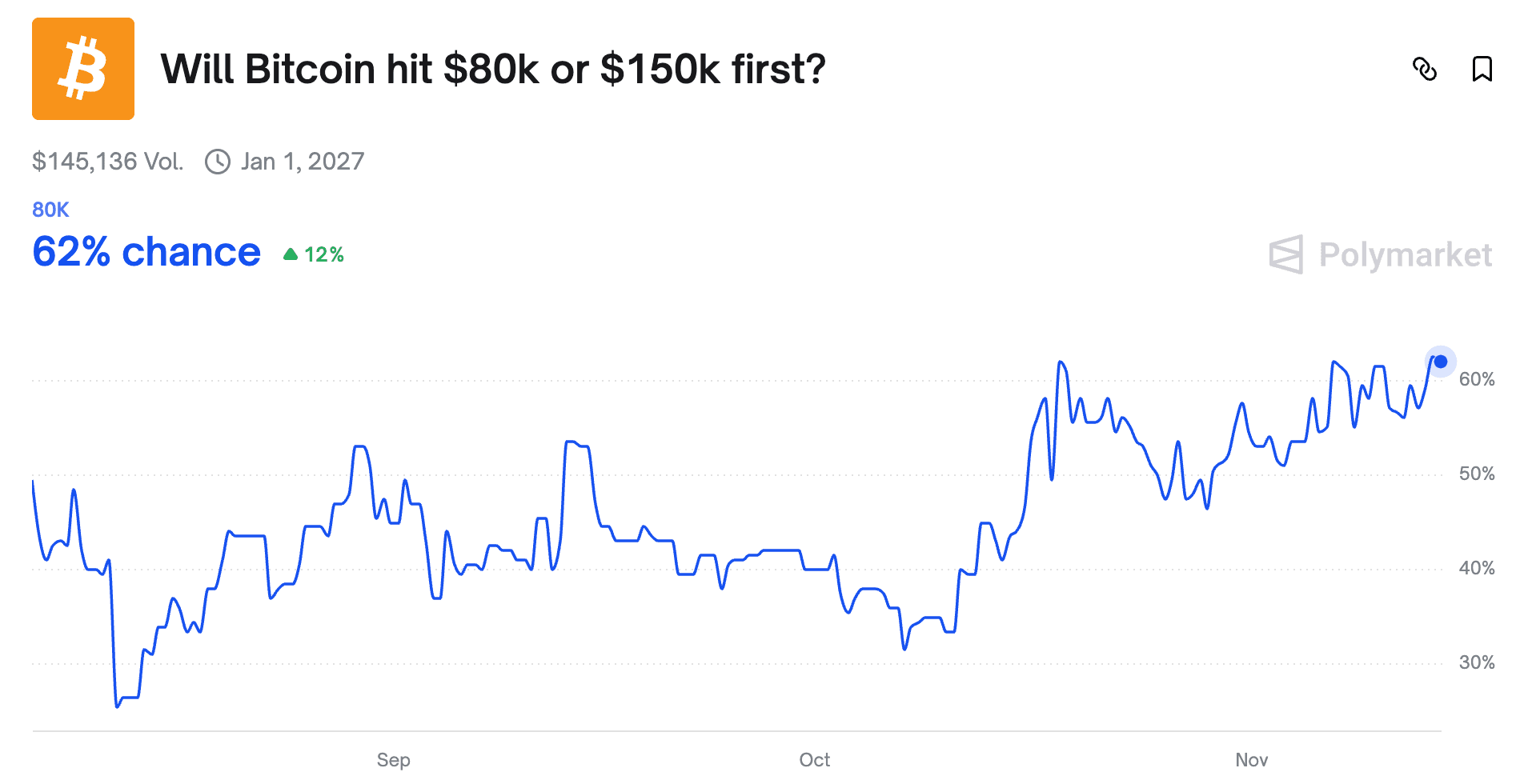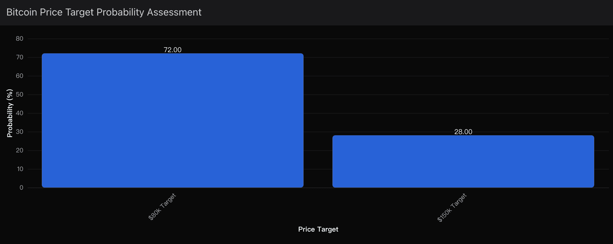 Polymarket and other prediction markets show only a 38% chance of Bitcoin reaching $150K this year, confirming that the market consensus is skeptical of a moonshot at this stage. The odds are priced in around current levels, with a peak probability not exceeding $80K in the near term.