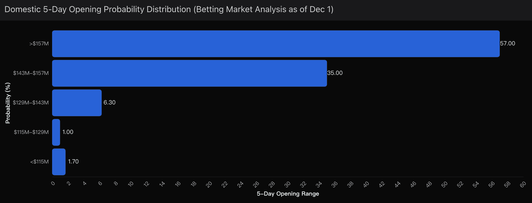 The combined probability of surpassing $143M sits at a commanding 92%, which in forecasting terms signals a dominant upper-range gravitational pull. The peak probability cluster (> $157M) suggests we may well see the base case challenged upward as the weekend unfolds.