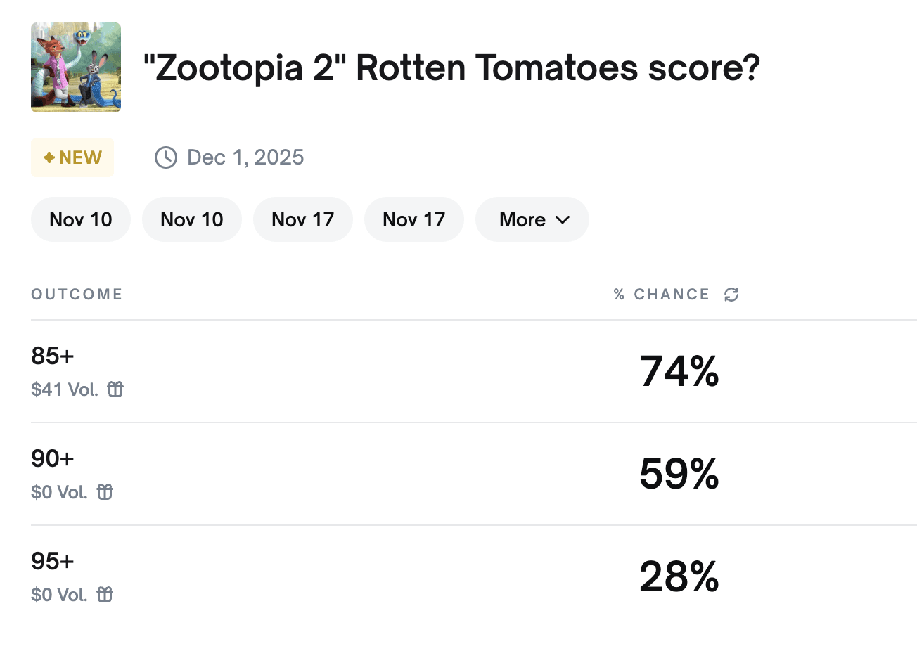 When I first noticed the chatter on Polymarket about Zootopia 2, the prediction threads were surprisingly quiet. No major markets had priced in its Rotten Tomatoes odds — a rarity for a Disney sequel.