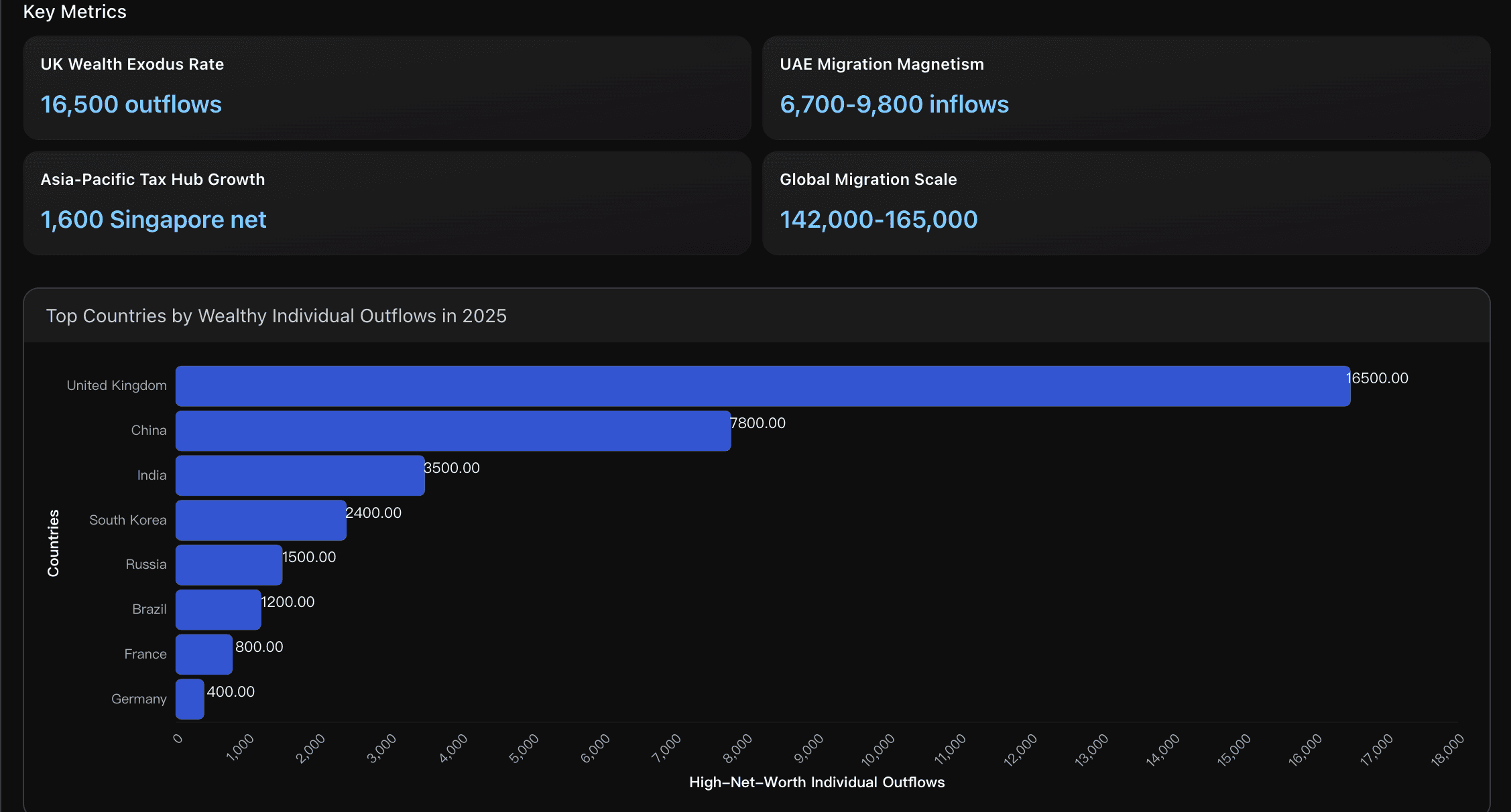 The United Kingdom leads global wealthy individual outflows with 16,500 high-net-worth departures in 2025, representing the largest single-country exodus driven primarily by adverse tax policy changes and regulatory uncertainty. This outflow significantly exceeds China's 7,800 departures, demonstrating how tax policy shifts can trigger mass wealthy migration even in established financial centers.