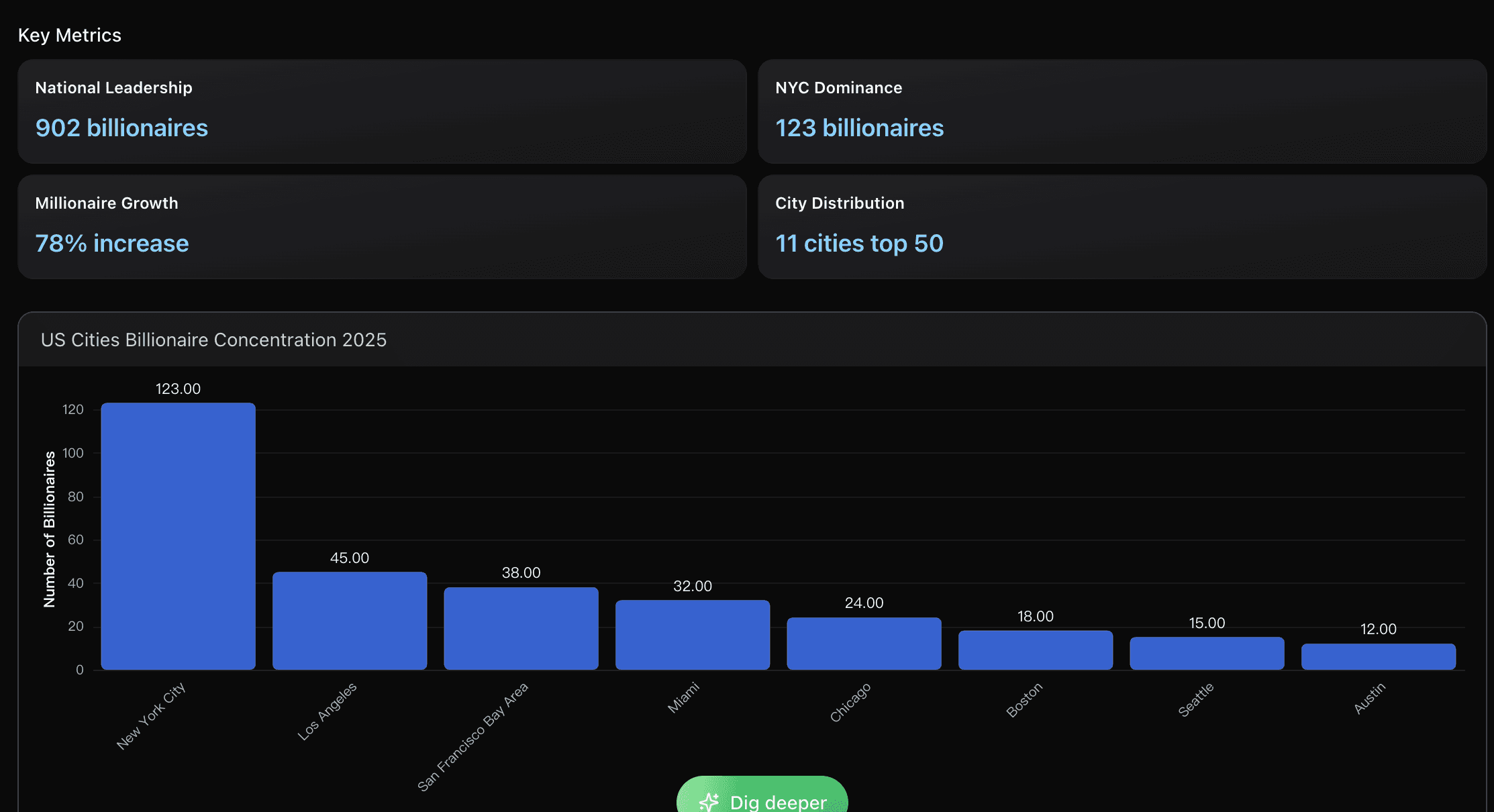 Los datos revelan un crecimiento extraordinario en ciudades emergentes como Austin (12 multimillonarios) y Miami (32 multimillonarios), que están atrayendo capital y talento desde los centros tradicionales.