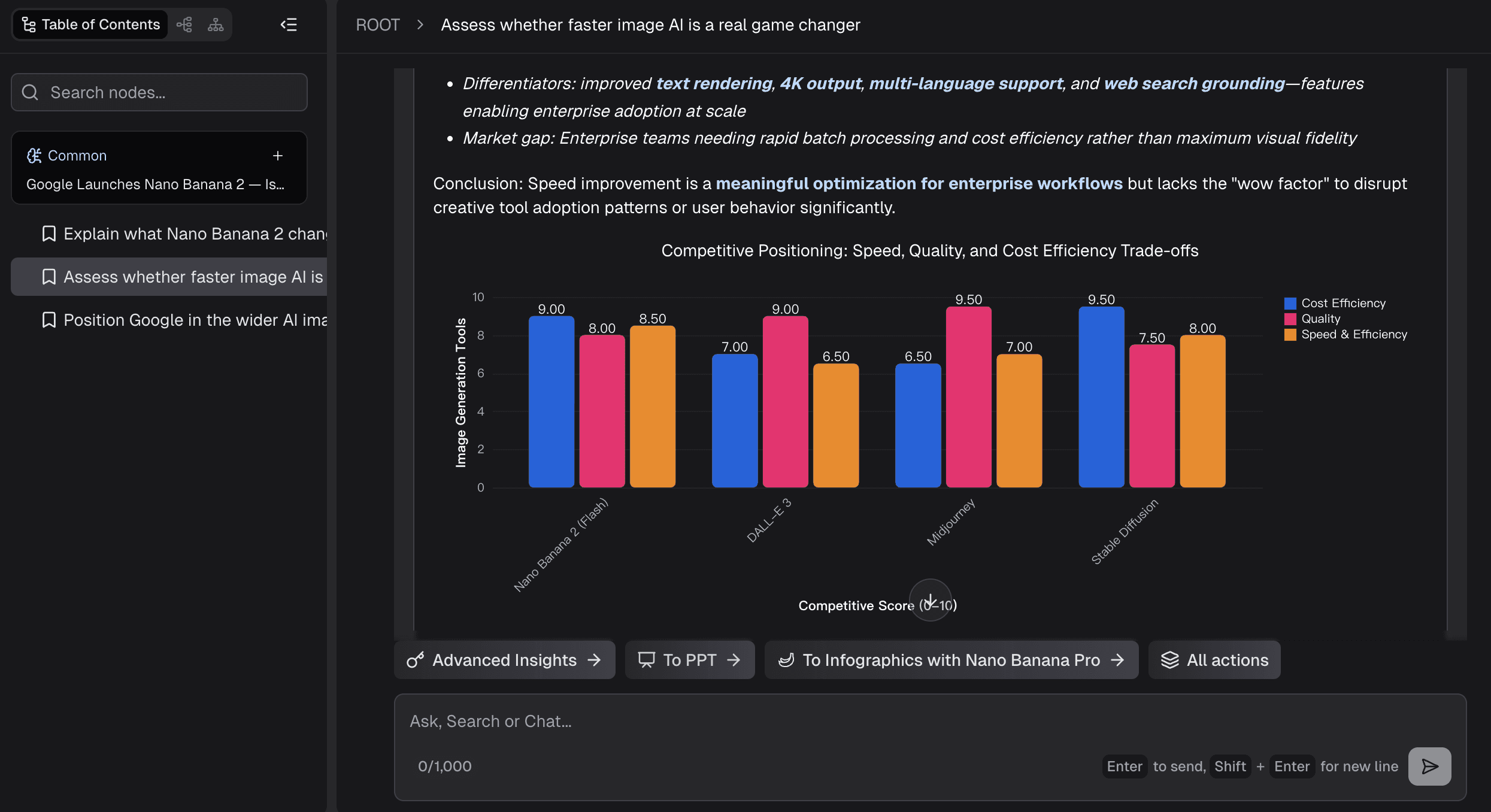 それは、膨大な生データファイル(Excel、CSV、PDF)をネイティブに読み込み、データをクリーンアップし、実用的な洞察を抽出し、それらを視覚的に素晴らしい、ビジネス向けのスライドにコードなしでマッピングすることができます。ハイステークスのビジネスプレゼンテーションが完璧な精度と視覚的インパクトを要求する場合、Nano Banana Proは無敵のチャンピオンです。