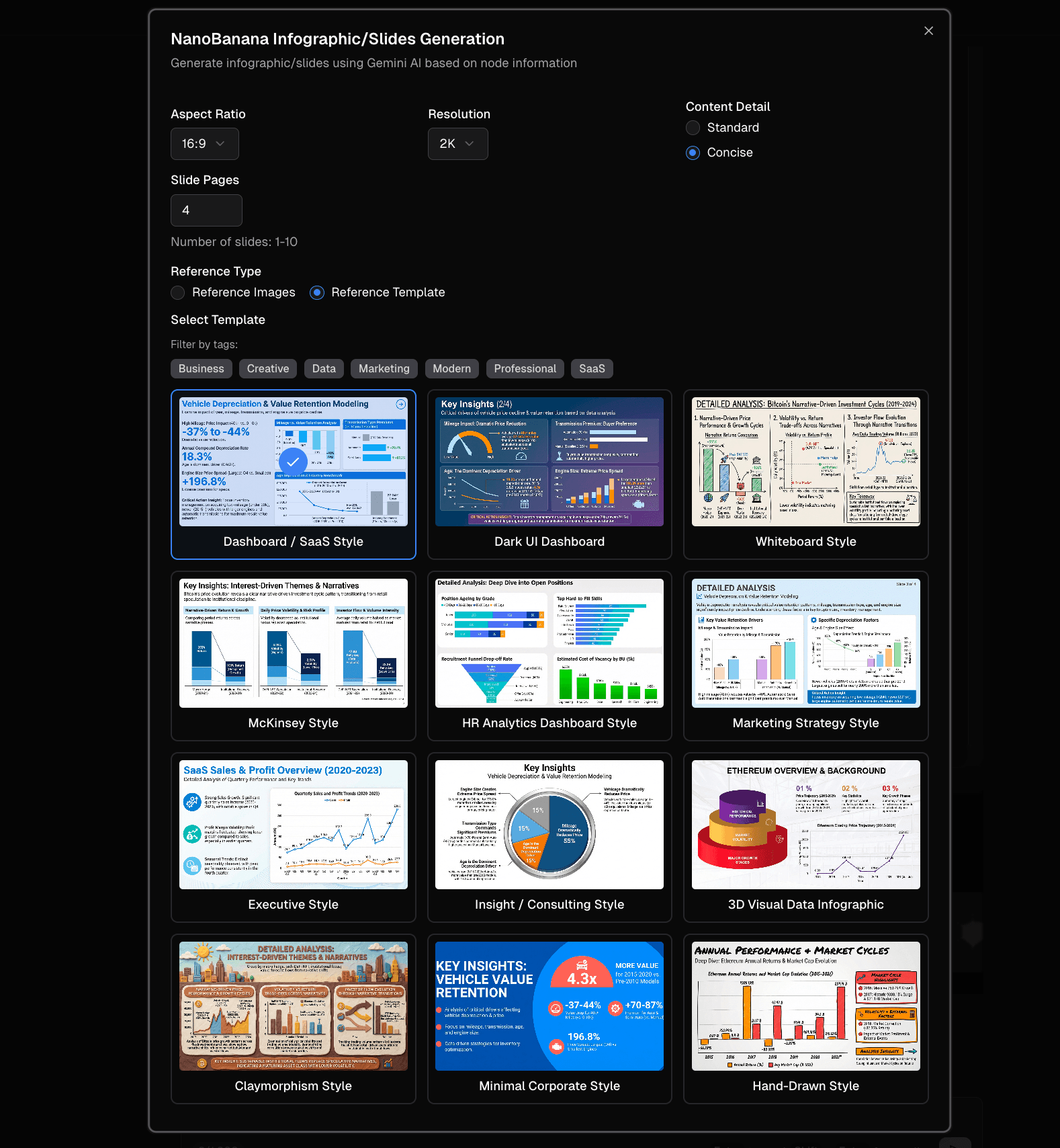 ナノバナナプロはスライドを作成するだけでなく、デザインを作成します。その生成能力は、高度なテンプレートスタイルのサポートをネイティブに搭載しています: