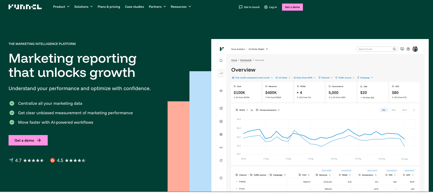 広範な統合: 100以上のマーケティングプラットフォーム(FB Ads、Analytics、LinkedInなど)に接続します。
