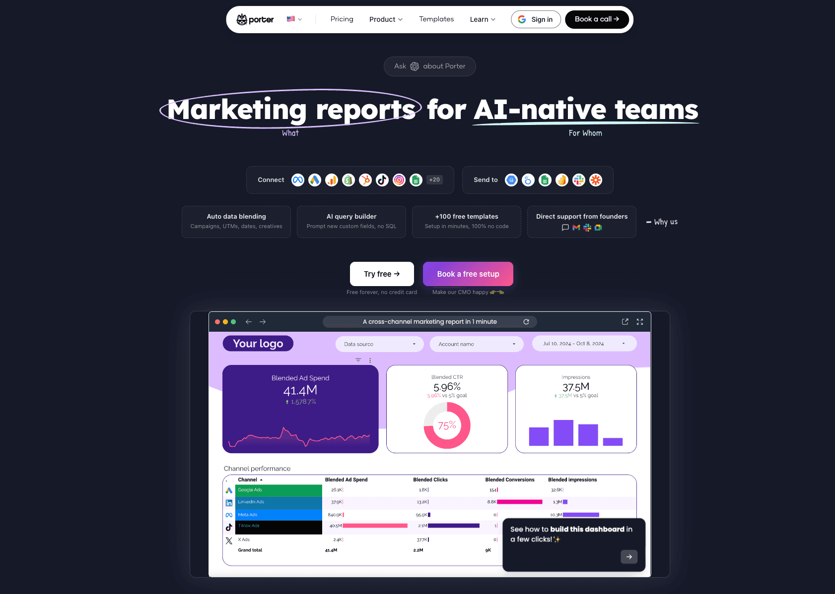 これらは、マーケティングデータソース(Google Analytics、Adsなど)に接続し、主要なパフォーマンス指標(KPI)を分析し、プレゼンテーション用の視覚的スライドを自動的に作成するソフトウェアソリューションで、生データとビジネスストーリーテリングのギャップを埋めます。