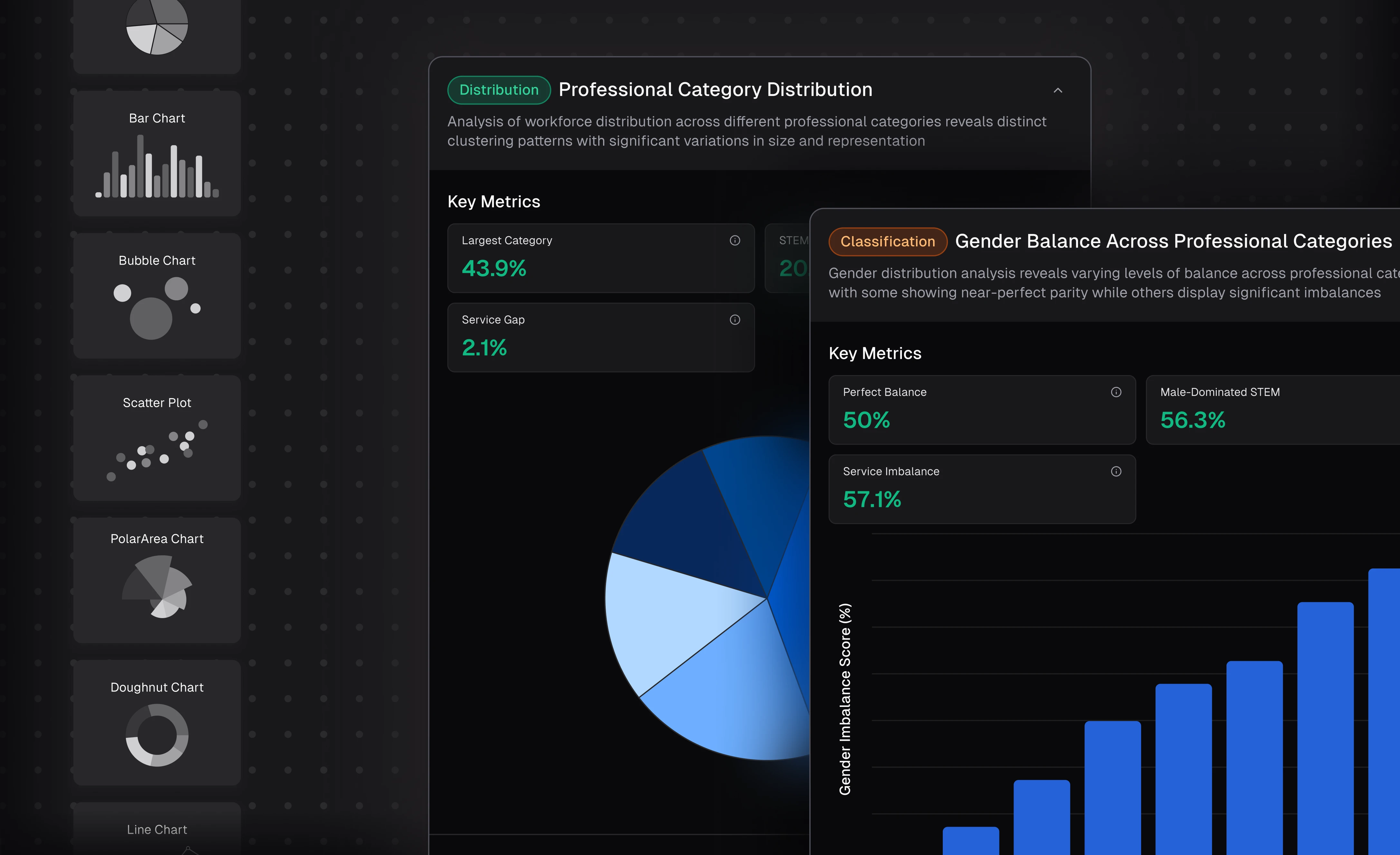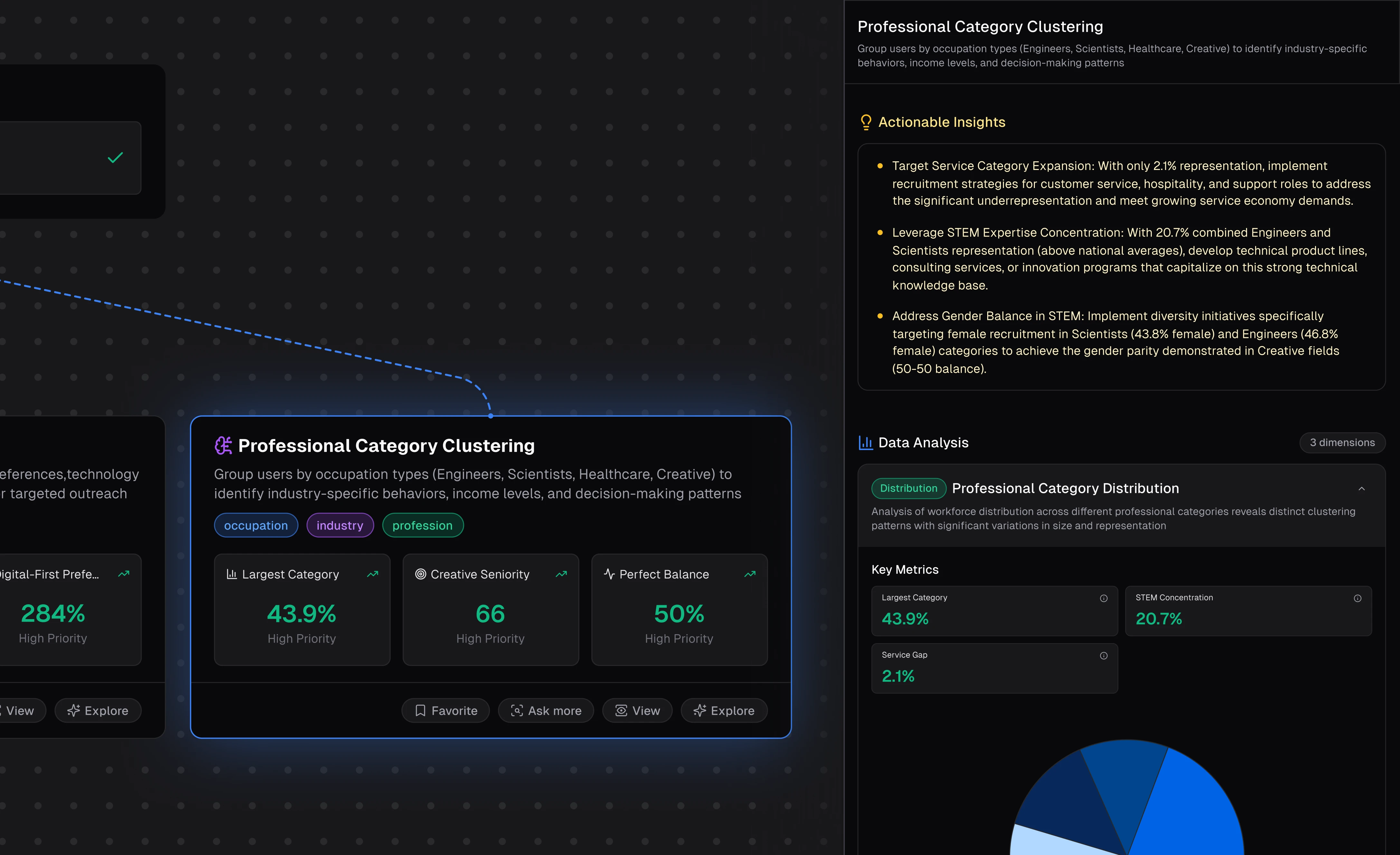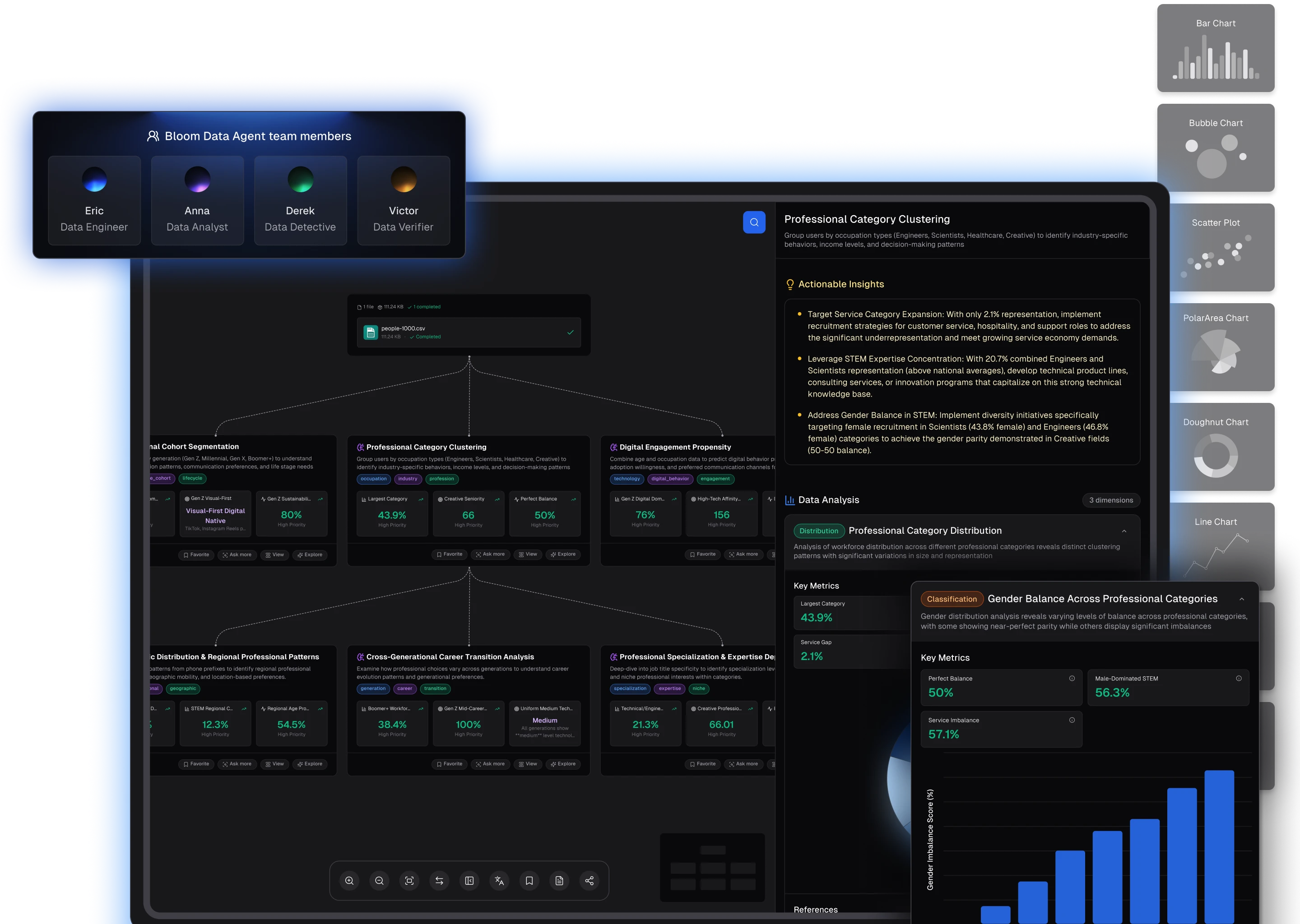 グラフ、テキストによるインサイト、そして質問が自然に融合する、柔軟で集中できるキャンバスでデータを探索。提示された探索パスに従うも良し、独自の質問を投げかけるも良し。Bloomはあなたの知的好奇心にリアルタイムで応えます。