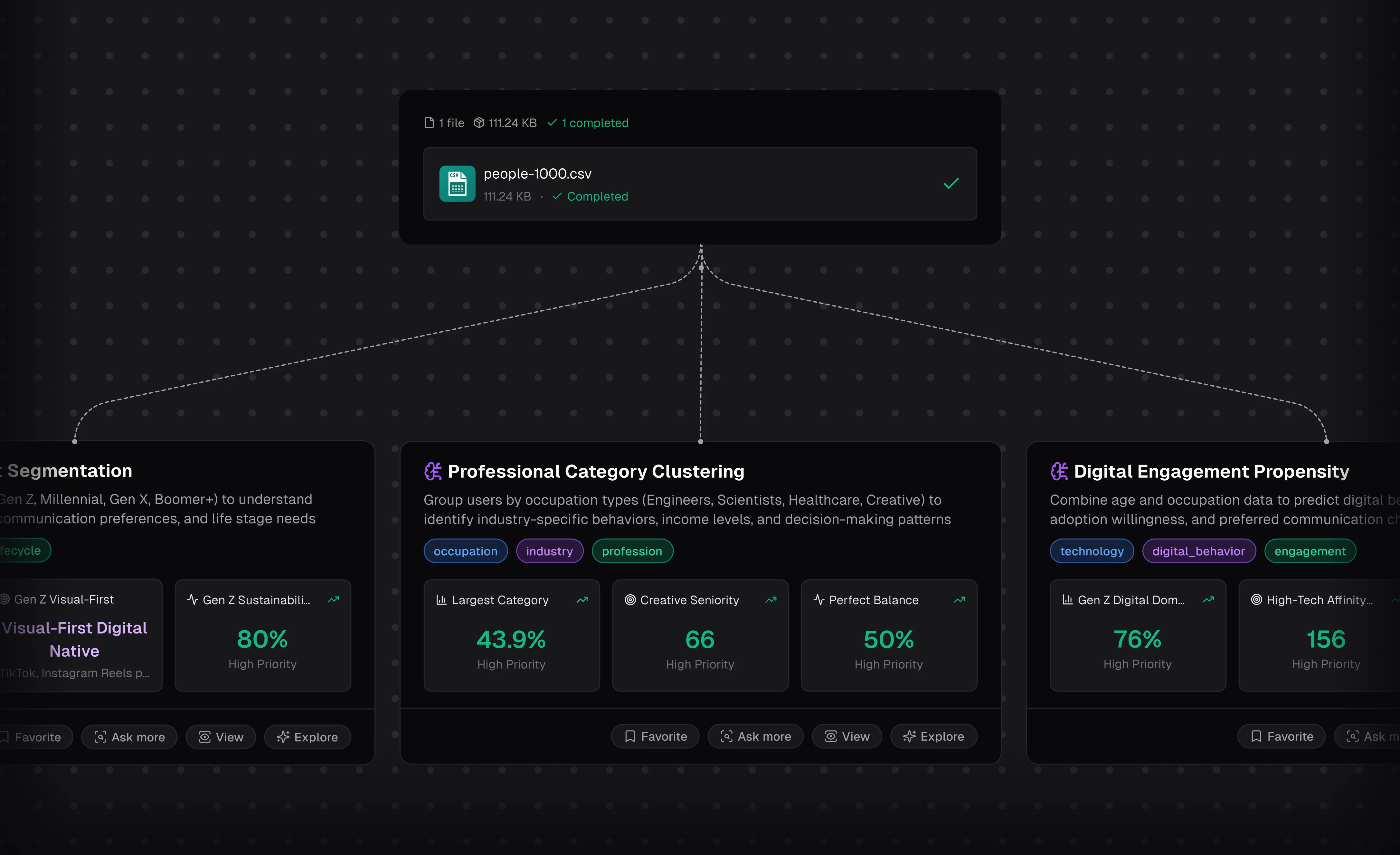 下準備や複雑な数式は必要ありません。ファイルをアップロードするだけで、あとはBloomのAIエージェントにお任せ。AIがデータを自動で整理・分析し、あなたのデータ分析を加速させる3つのスマートなアプローチを提案します。