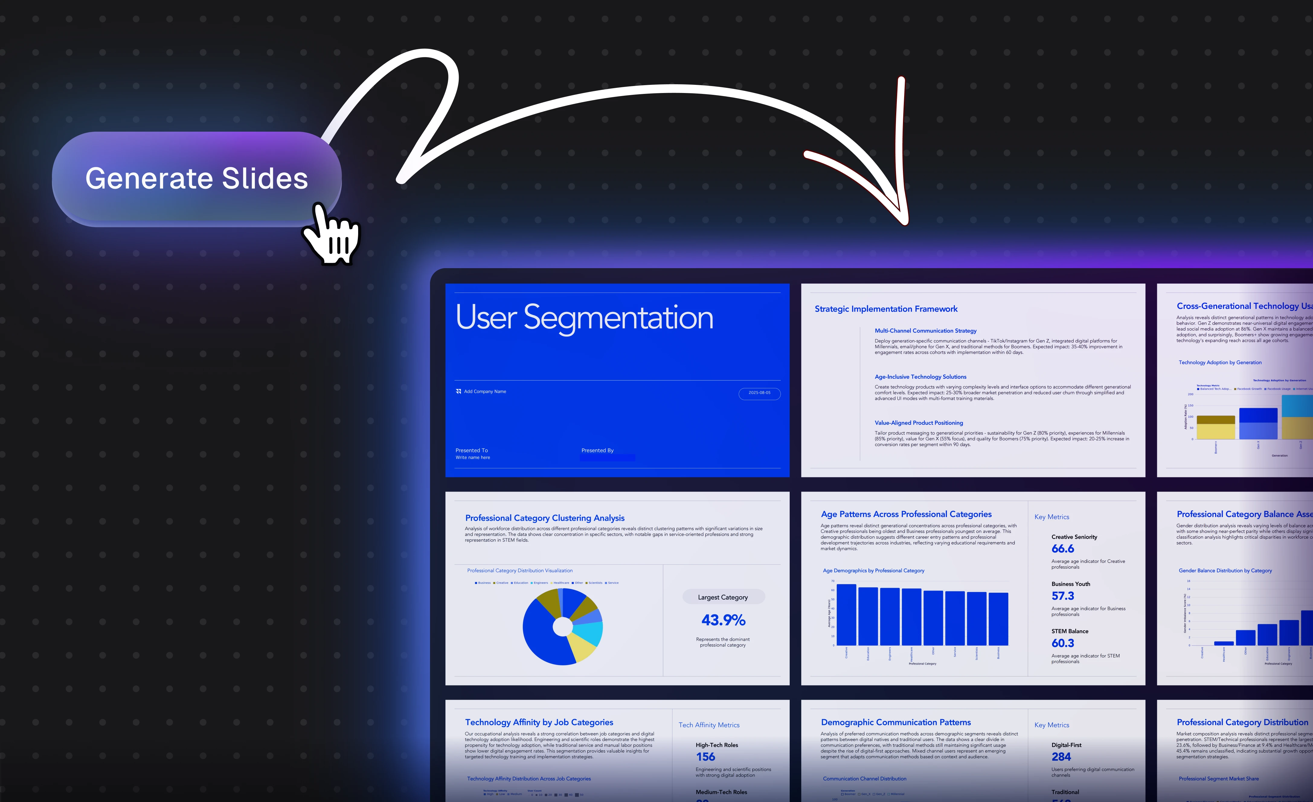 Bloomは、キャンバスで作り上げた探索結果を、そのままプロ仕様のレポートに変換します。AIが自動で主要なインサイト、チャート、発見を厳選し、あなたのデータストーリーを明確で説得力のある形で表現します。経営層やチーム、関係者への報告に最適な資料が、瞬時に完成します。