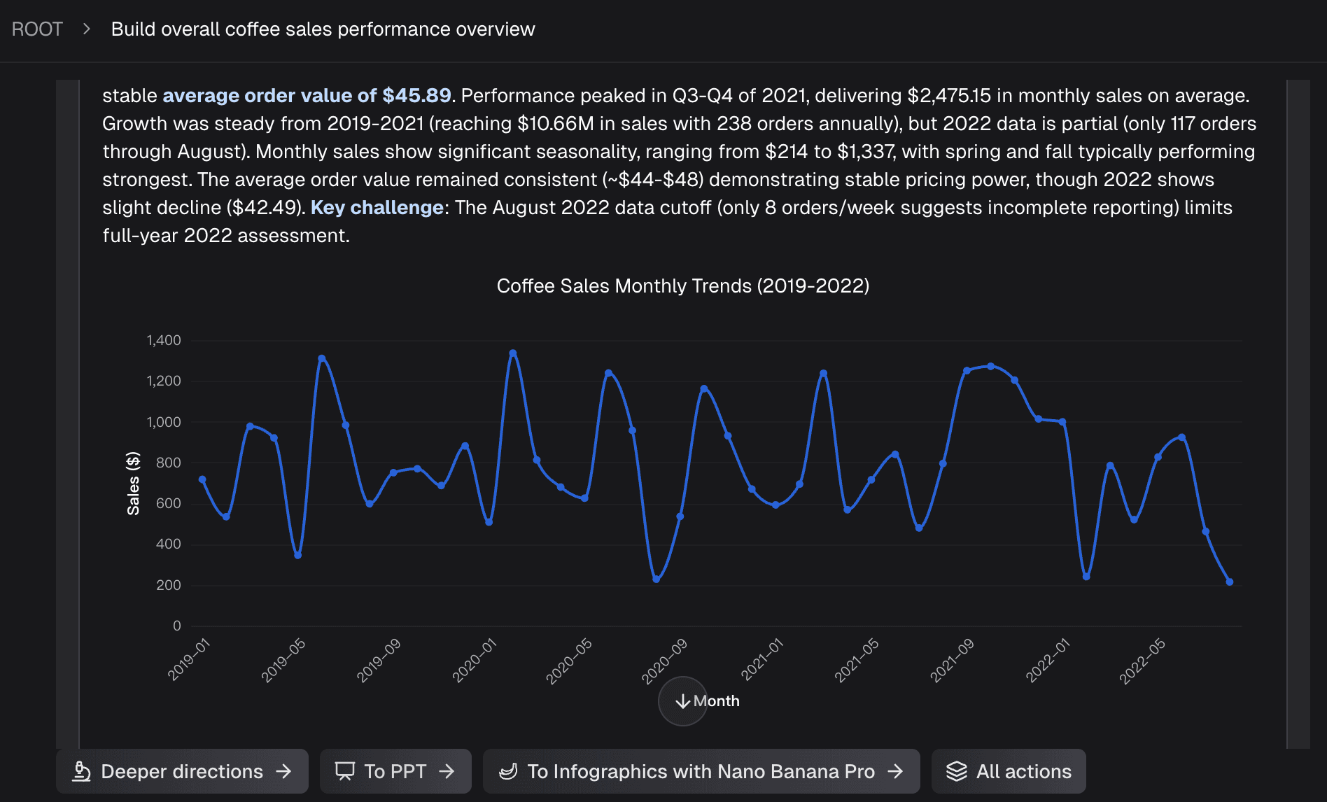 Based on your query, the platform automatically selects the most appropriate visual format (e.g., a clustered bar chart) and plots the data. Furthermore, it generates a brief text summary of the key insight, saving you the analytical heavy lifting.